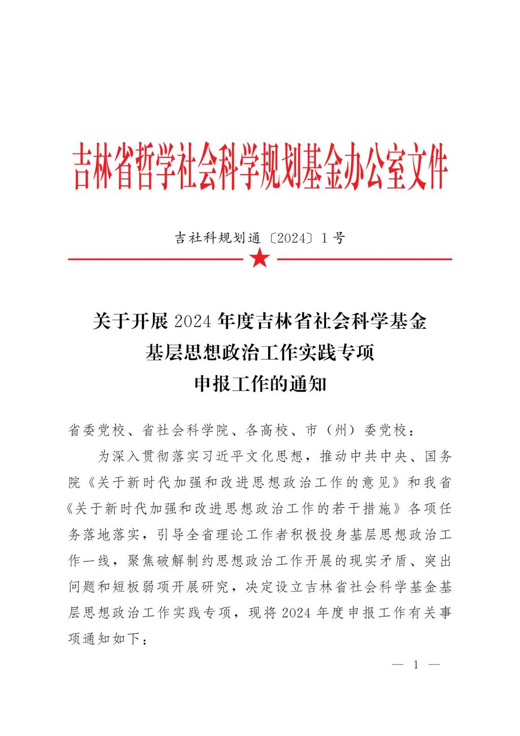 关于开展2024年度吉林省社会科学基金基层思想政治工作实践专项申报工作的通知
