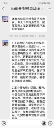 将师承同学分成两个小组,每周日跟尚晓玲导师随诊,尚老师常常告诫同学们要“读经典,跟名师,早临床”,将自己多年的经验毫无保留地传授给学生,使学生在临床实践过程中既开阔了眼界,又增长了知识,更增加了对中医药的热爱,同时要求同学及时整理和总结跟师学习心得体会。