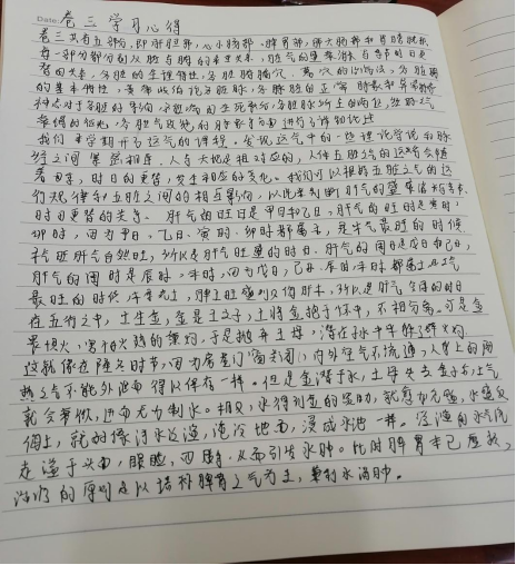 了解到本章主要学习了五脏以及六腑各自的生理特性,以及其易感病的时间和季节。重点学习了五脏的平脉和病脉以及真脏脉。主要通过其生理特性,五行相生相克关系来推导其病的特性、脉的特性。对于脉来的次数和其相对应的疾病轻重有了更深刻的了解。但对一些问题仍存有疑问,比如,心脉微大会有善泪出的表现,李俊杰同学认真为我从心痹引背,推导到膀胱经受邪,在沿膀胱经巡行而所致此症。但我感觉此理解比较繁杂,希望通过后续学习,继续加深了解。学识也不太了解心单这个病症。查阅资料之后才明白是由于寒邪侵犯心经,而所致的小肠疝气。并不是指心脏发生疝气。这一节利用中医基础理论知识还是比较容易读懂的,同学讲课也非常棒,期待下次学习。